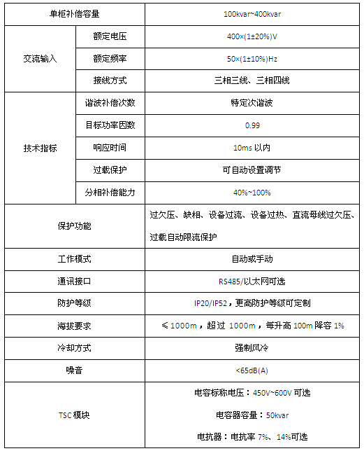 技术参数:无功补偿分补容量100kvar,共补容量50kvar